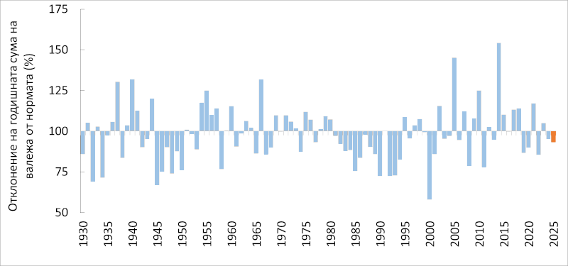 Валежите през изминалата 2025 г. средно за страната са близо до климатичните норми, като варират в широки граници през отделните месеци. Лятото на 2025 г. е най-сухото от 1930 г. насам, докато всички останали сезони са със средни валежи за страната над климатичните норми. Валежният дефицит през годината е най-силно изразен през месеците юни (минус 74%), юли (минус 68%) и септември (минус 67%). С най-много и повсеместни валежи са месеците октомври (плюс 172%) и ноември (плюс 64%). Предварителните оценки сочат, че за 2025 г. средната годишна сума на валежите е 616 мм (л/кв.м), което е само с около 7% под климатичната норма.