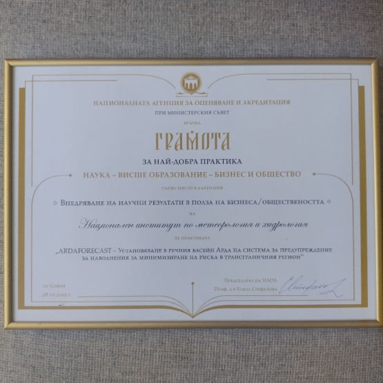НИМХ беше отличен с първо място в категорията "Внедряване на научни резултати в полза на бизнеса и обществото" на първите годишни отличия за добри практики "Наука - висше образование - бизнес и общество" на НАОА.