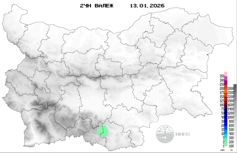 Copyright © 2026, НИМХ. Съдържанието на сайта на Националния институт по метеорология и хидрология (НИМХ) и технологиите, използвани в него, са под закрила на Закона за авторското право и сродните му права. Всички текстови и графични изображения, публикувани в сайта, са собственост на НИМХ, освен ако изрично не е посочено друго. Ползвателите на съдържанието на сайта на НИМХ се задължават, ако го разпространяват, да не го променят, изменят, редактират или модифицират и задължително да посочват източника на информация – НИМХ.