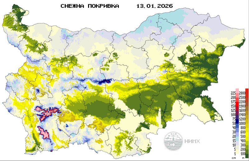 Височина на снежната покривка по данни от станциите на НИМХ към 7.30 ч на датата, посочена на картата. Обновява се веднъж дневно към 12 ч. Лява скала — снежна покривка в сантиметри. Дясна скала — надморска височина в метри за местата без снежна покривка.