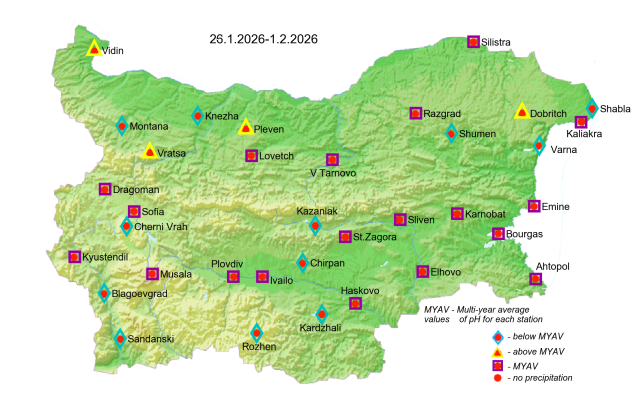 This map of precipitation acidity is issued every week if there was any precipitation.