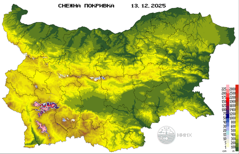 Височина на снежната покривка по данни от станциите на НИМХ към 7.30 ч на датата, посочена на картата. Обновява се веднъж дневно към 12 ч. Лява скала — снежна покривка в сантиметри. Дясна скала — надморска височина в метри за местата без снежна покривка.