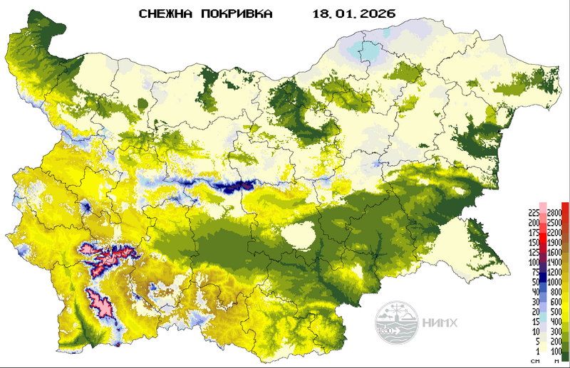 Височина на снежната покривка по данни от станциите на НИМХ към 7.30 ч на датата, посочена на картата. Обновява се веднъж дневно към 12 ч. Лява скала — снежна покривка в сантиметри. Дясна скала — надморска височина в метри за местата без снежна покривка.