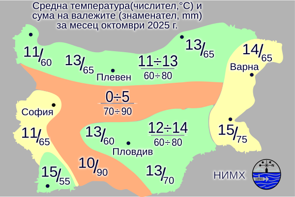 Тази година през октомври се очаква средната месечна температура да бъде около нормата, която в равнините е между 11˚ и 15˚, по високите полета - между 10˚ и 13˚, в планинските райони - от 0˚ до 7˚. Най-високите температури през октомври ще бъдат между 25° и 30°, а най-ниските - между минус 3° и 2°, по-високи в източните райони. Месечната сума на валежите ще бъде около и над нормата, която за по-голямата част от страната е между 40 и 70 л/кв.м., а за югоизточните райони е между 50 и 100 л/кв.м. През първото десетдневие от октомври динамиката на атмосферните процеси ще бъде повишена. През повечето дни ще преобладава облачно време. През периода 2-5-и октомври и в края на десетдневието, под влияние на преминаващи южно от страната средиземноморски циклони, ще се създаде валежна обстановка. На много места се очаква валежите да бъдат значителни. Температурите през десетдневието ще бъдат близки и по-ниски от обичайните. През повечето дни от второто и третото десетдневие времето ще се определя от антициклонален тип циркулация. Температурите относително ще се повишат и ще се доближат до климатичните норми. При изяснявания минималните температури на много места в страната ще се понижават до и под 0˚ и се очаква образуването на слани. Ще преобладава слънчево време, на места в равнините и котловините в часовете до обяд ще има ниска облачност или мъгла. Вероятност за преминаване на атмосферни фронтове със слаби превалявания и относително понижение на температурите има около 15-и, 20-и октомври и в края на месеца. Изготвил: гл. ас. д-р Красимир Стоев – синоптик в НИМХ