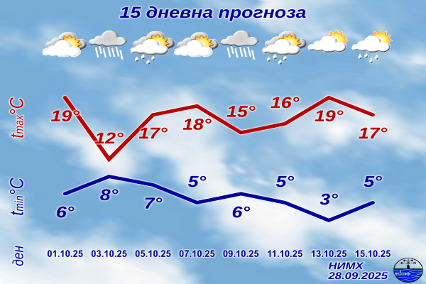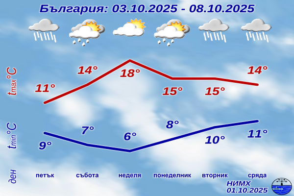 В четвъртък и петък ще бъде облачно с повсеместни валежи от дъжд, в планините над 1800 m - от сняг. В много райони валежите ще са временно интензивни и значителни по количество. Вятърът ще се ориентира от североизток, ще се усили и с него ще застудява. Температурите ще са почти без дневен ход - от 6°-7° в западните до 19°-20° в югоизточните райони и по Черноморието. В петък, с продължаващото застудяване в планинските райони в Западна България и под 1000 m, дъждът ще преминава в сняг. В събота от юг валежите ще спират, а облачността ще се разкъсва. Вятърът ще се ориентира от запад, ще бъде слаб. Студено за началото на октомври с минимални температури между 2° и 7°, по-високи по Черноморието, максимални - между 13° и 18°. В неделя, след временно намаление на облачността от запад тя отново ще се увеличи и по-късно през деня отново ще започнат валежи. Вятърът ще се ориентира от запад-северозапад, минималните температури ще се задържат без промяна, а дневните ще се повишат с 3-4 градуса. През първите дни от новата седмица отново се повишава вероятността за синоптична обстановка с повсеместни и значителни по количество валежи. Вятърът ще се ориентира отначало от запад-северозапад, впоследствие от север-североизток. Температурите ще остават с малък дневен ход, в понеделник в по-голямата част от страната между 15° и 20°, а във вторник - между 11° и 16°.