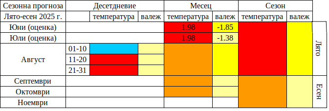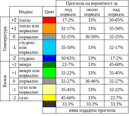 Сезонните прогнози се отнасят за средни стойности на метеорологичните елементи за период от 3 месеца и са в термини на вероятности. Неповишена вероятност за събитие под, над или около нормата е 33.3%. Така може да се очаква, че средно климатично, сезоните попадат с еднаква вероятност (33.3%) в една от трите категории: около нормата, под нормата и над нормата. Целта на сезонните прогнози е да се провери чрез различни статистически и числени методи, дали има повишена вероятност предстоящ сезон да се окаже в някоя от трите категории за съответния елемент. Категориите под, над или около нормата, използвани за целите на тази сезонна прогноза, се определят спрямо норма за периода 1980-2009. Малките пространствени мащаби на България в сравнение с мащабите на климатичните структури, които определят характера на сезоните, както и неопределеността в сезонните прогнози, ни карат да използваме индекс за характеризиране на сезоните (и месеците) за страната като цяло. За отделните градации на индекса се използват традиционни цветни градации, дадени в във втората таблица. На сезонните прогнози с различна степен на вероятност за попадение в екстремните категории съответстват са присвоени същите цветни степени, също дадени във втората таблица. В първата таблица са посочени установените индекси за изтеклите или изтичащите месеци от текущия сезон и прогноза на индекса в интервал за предстоящите три месеца както и за текущия и предстоящия календарен сезон.